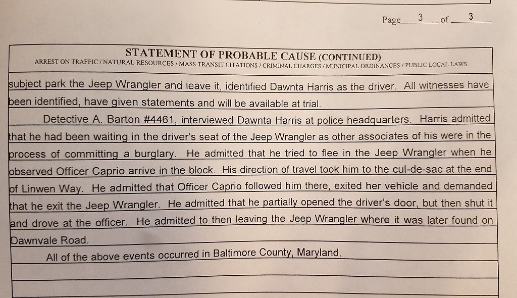 “Harris admitted that he had been waiting in the driver’s seat of the Jeep Wrangler as other associates were in the process of committing a burglary,” the charging document states.