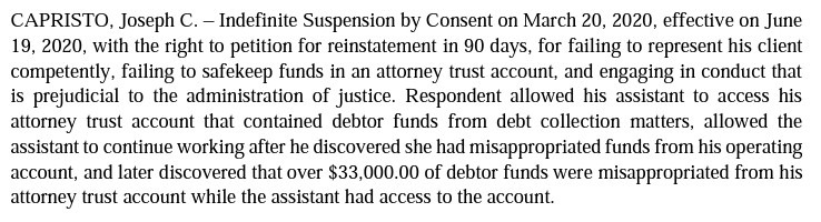 Court records show that the Maryland Supreme Court suspended attorney Joseph C. Capristo following a complaint by the Maryland Attorney Grievance Commission.