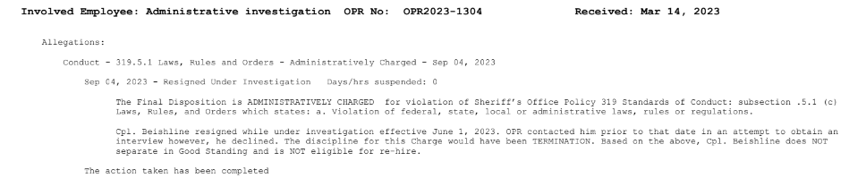 A PUBLIC INFORMATION ACT request of the St. Mary’s Sheriff’s Dept. resulted in the following record revealed that Alvin Beishline declined to be interviewed and resigned his position.