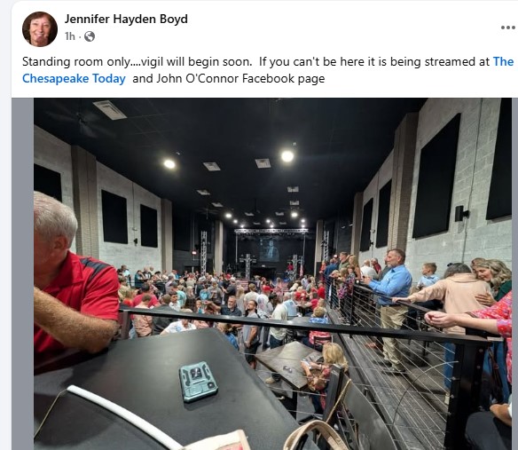 The vigil will be held at 6 pm at the Rex in Leonardtown, capacity is about 400, be there early to assure entry. As there is an active nutty community in the area, hopefully, law enforcement agencies will activate a security plan.